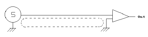 Il cavo, a questo punto, si trova immerso nei disturbi che possono essere sia di tipo elettromagnetico che di tipo elettrostatico; da questi ultimi ci si protegge facilmente utilizzando un cavo schermato che, come noto, funge da gabbia di Faraday. Ma, se noi osserviamo bene la figura, ci accorgiamo che fra i due collegamenti di massa viene a crearsi una spira ad alta impedenza (indicata col tratteggio), ciò vuol dire che viene ad indursi una tensione che sarà tranquillamente amplificata dall'amplificatore.