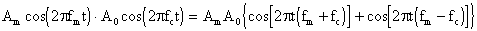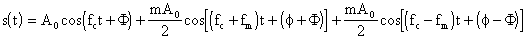 Da qui posso notare che esistono due righe spettrali laterali simmetriche rispetto alla frequenza della portante, una a frequenza fc - fm ed una a frequenza fc + fm; inoltre non ho, nello spettro, la riga relativa alla portante fc. Se, anziché modulare con un tono puro, avessi usato una banda di frequenze, avrei ottenuto due bande di frequenze al posto delle due righe spettrali.